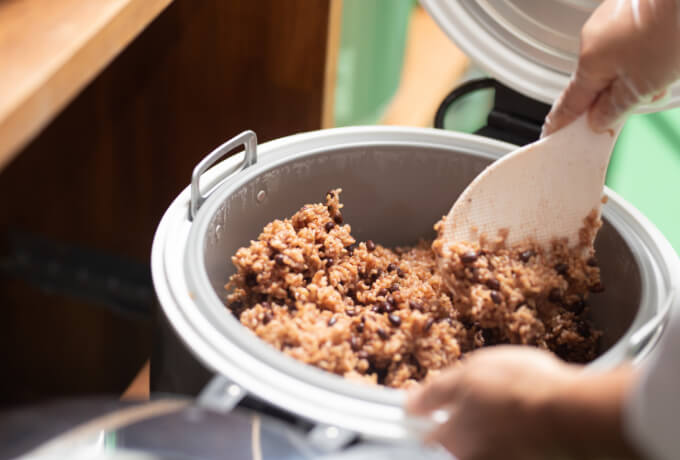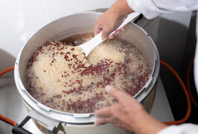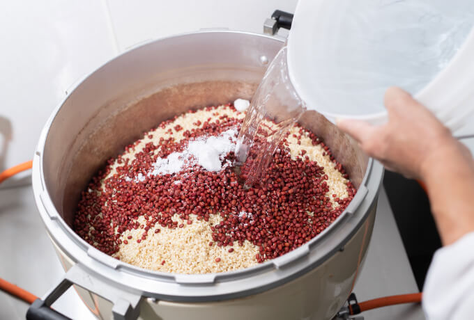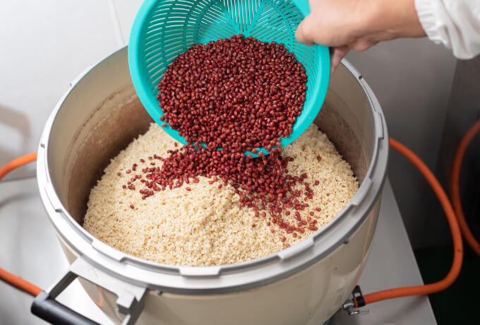 玄米に小豆や塩を混ぜ合わせて、炊飯がスタートします。