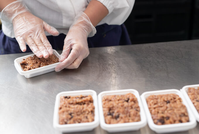 3日間寝かせた玄米ごはんを丁寧にパック詰めし、お客さまの元にお届けする出荷作業を行います。