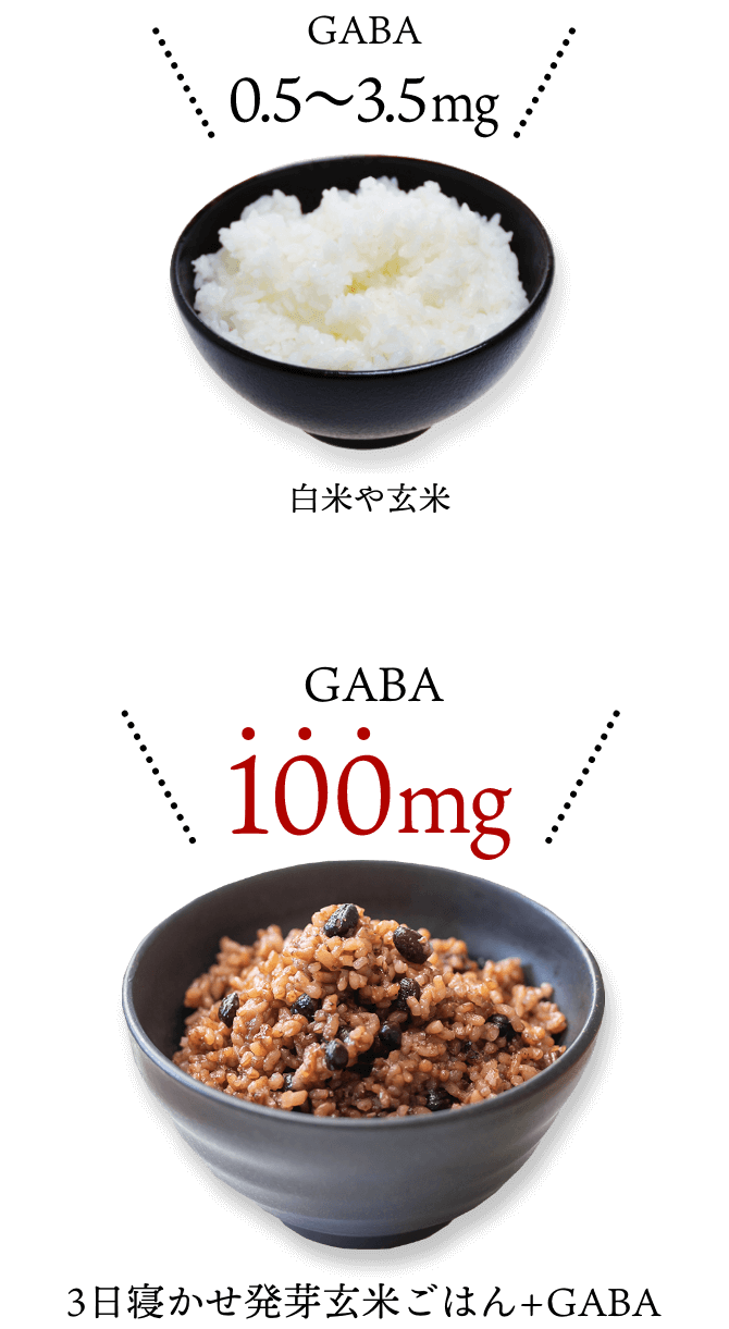 「3日寝かせ発芽玄米ごはん+GABA」は、白米に比べてGABA含有量がなんと200倍!の100mg含まれています!